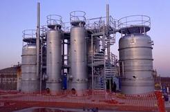 热水解反应罐(与化工常用的反应釜很类似,����� �������Ƴ������������ �������Ƴ�������但可以蒸汽直接加热,且蒸汽(����� �������Ƴ������������ �������Ƴ������������ �������Ƴ�������11bar左右)从底部进入):它的作用是����� �������Ƴ������������ �������Ƴ�������进行水热反应。条件为:约6bar,165-170℃,停留时间约半个小时,然后减压,将压力减少����� �������Ƴ������������ �������Ƴ�������到3bar左右,将污泥输送到闪蒸罐。经这个罐子后的污泥����� �������Ƴ������������ �������Ƴ������������ �������Ƴ������������ �������Ƴ�������DS达12%-13%。